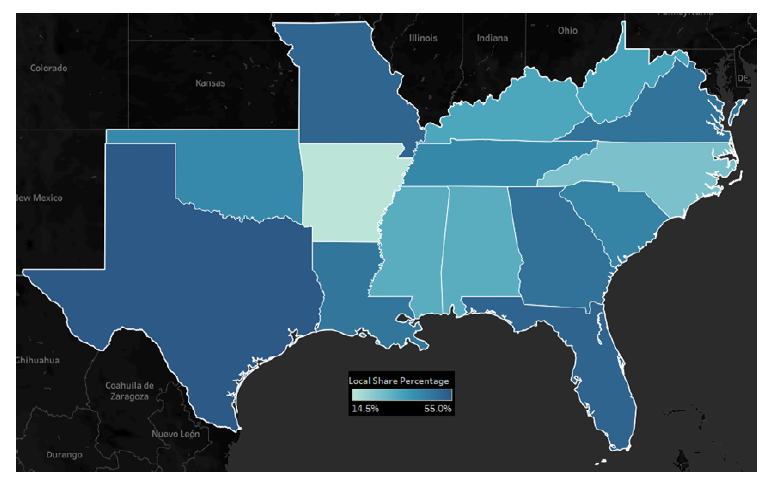 Among the Southern states reviewed, only Virginia employs a methodology that is explicitly labeled an “LCI.” Other states use local equalization or expected local share models that functionally serve the same purpose but differ in statutory structure, methodology, and transparency. For states interested in a model approximating the Commonwealth of Virginia’s approach, the following formula, utilized by the state’s Department of Education for the 2024–2026 biennial budget, may provide an estimate as to what supplemental support an LCI would provide to other states in the region.