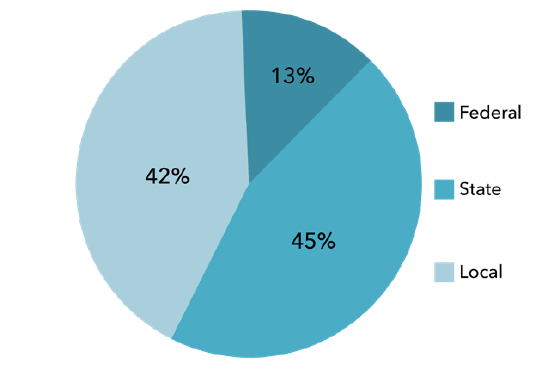 In the U.S., local control is a founding principle of public education, which makes sense given that the most significant financial burdens for financing public K-12 education fall on state and local governments. Specifically, more than 36 percent of public school funding comes via local property tax levies. While a stable and easily predictable funding source compared to other sales or income-based taxes, the main drawback of the reliance on property taxes to support public education is the disparity of property values among geographical areas as well as tax base inequality, as certain commercial, government, or public service-related property owners have significant exemptions or waivers of property taxes.³