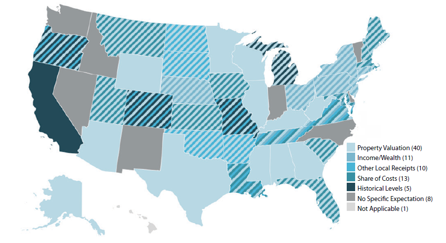 In most states, the education funding formula includes an expectation that the local school district will contribute some portion of the amount needed to fund education in that district. This expected local share is subtracted from the total amount calculated by the state to be necessary to educate the district’s students, and the difference is the amount of state education funding the district will receive, typically regardless of whether the locality raises the expected amount in education taxes.⁵ The amount of the expected local contribution varies from district to district, and states base their expectations on several different factors or a hybrid mix of factors, including: