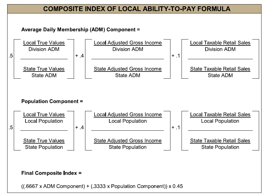 - Income and/or Wealth: The formulation of a metric to assess the revenue a district can reasonably be expected to raise, as determined by indexing relative purchasing power or comparing regions with higher average wage rates.
