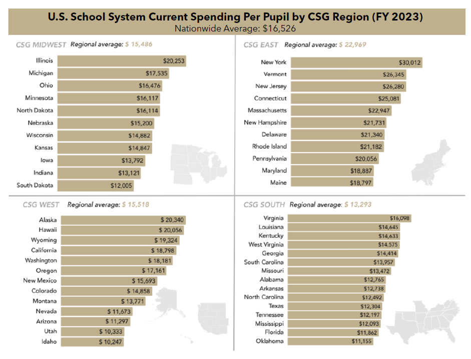 - “U.S. School System Current Spending Per Pupil by Region: Fiscal Year 2023,” U.S. Census Bureau, May 1, 2025.