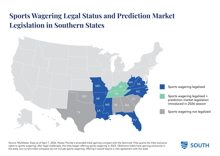 Legislators in 11 states have introduced legislation to regulate prediction markets in 2026, including Kentucky and Tennessee. States are taking a variety of different approaches, ranging from full authorization and regulation to a full ban. Several states have bills that would prohibit prediction markets from offering event contracts based on events such as politics, athletic events, securities, and catastrophic events, and some focus on prohibiting marketing to minors. Some state bills also include consumer protection provisions, such as requirements for operators to refund cancelled wagers and protect customer winnings.